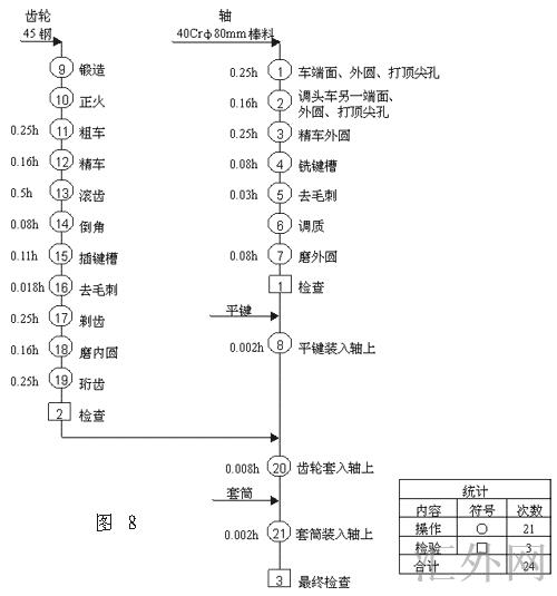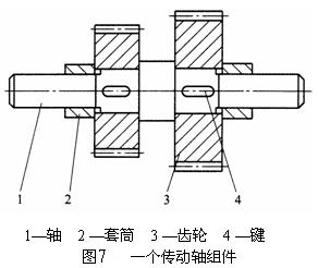 比如:生产如图7所示的一个传动轴组件,该组件由轴、齿轮、套筒、键四种零件所构成,各零件的工艺过程如表1(传动轴组件各零件的工艺过程)所示,绘出该组件的工序程序图。
