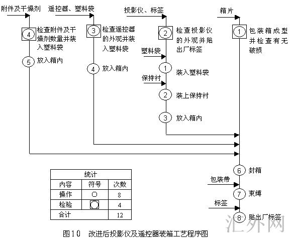 通过表2的提问分析,发现上述工序均不能取消,但可以通过工序合并,高达优化的目的。改进后投影仪及遥控器装箱工艺程序如图10所示。