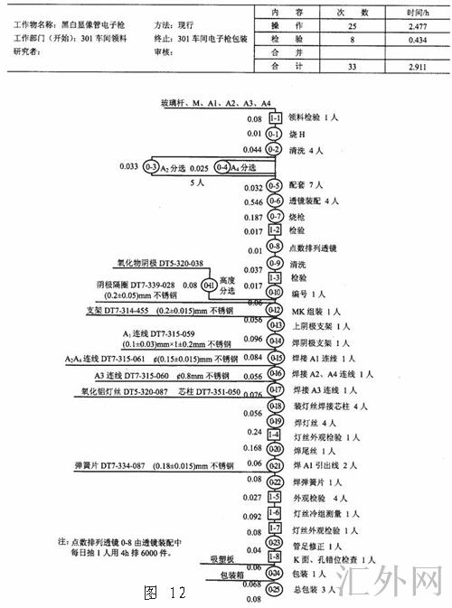图12是电子枪生产线改进前的工艺程序图。图中真实地记录了生产线的供料点、供料规格和用量、时间、人士配备及电子枪生产线的概况和各作业之间的相互关系。进而可对整个生产线的现况有所了解,为工艺程序图的分析给予了必要的资料和根据。