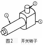 如图2所示的开关转子由轴①、停档②、及模压塑料体③三部分构成。它是经历对上述三个零件分别加工,最终装配组成。