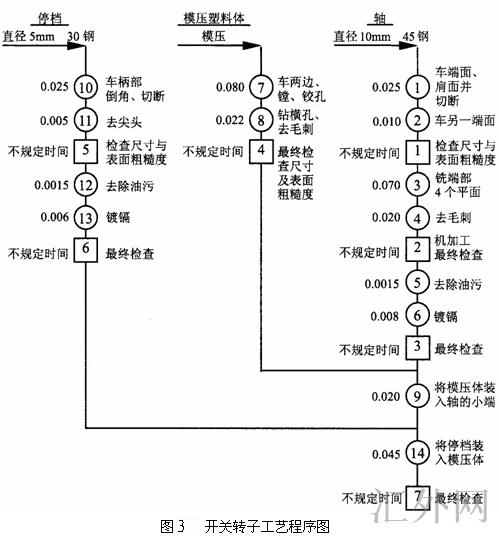 依据工艺程序图绘制的方法及每个零件加工的工艺过程,形成图3所示的开关转子的工艺程序图。