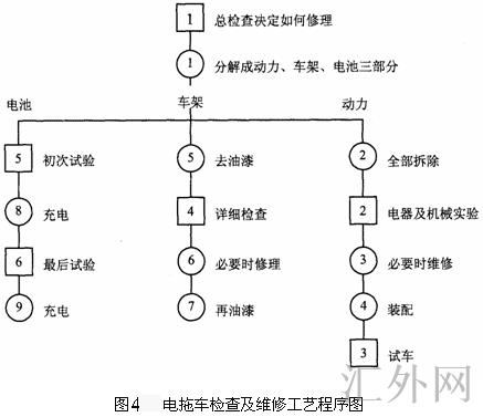 假使一件工作需分成几个部分去分别处理,这时由一个首要程序分成几个分程序。一般是将首要的分程序置于最右边,其余的依其重要性自右向左依次排列。比如电拖车检查及维修的工艺程序图,如图4所示。