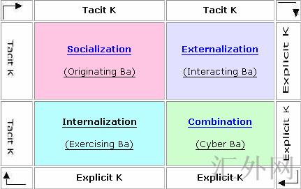 SECI模型中四个知识转化阶段 潜移默化 第一种模式——“潜移默化”(社会化),指的是隐性知识向隐性知识的转化。它是一个通过共享历经建立隐性知识的过程,而获取隐性知识的核心是通过观察、模仿和实践,并非是语言。在具体的商务环境中执行的所谓“在职培训”差不多应用的就是该种原理。比如:(l)公司与提供商及顾客直接交往及互动,因此得到了知识。(2)勤于在公司内部各处所走动及视察,因此得到隐性知识。一般在公司内部各个事实职场 皆可搜集到最新的讯息。社会化也包含隐性知识之散布 。将一个人现存的想法或意念直接传达或移转给他的同仁或部属, 强调“大我”的精神,愿意让人分享他个人的知识,因此创造了一个共有的知识转化之场所(ba)。 外部明示 第二种模式——“外部明示”(外化),指隐性知识向显性知识的转化。它是一个将隐性知识用显性化的概念和语言清晰表达的过程,其转化手法有隐喻、类比、概念和模型等。这是知识创造过程中举足轻重的环节。在商业实务方面,外表化须有下列两项要素之协助:(l)将隐性知识转化成显性知识,这会涉及一部分表达的技术,以便将一个人的想法或心意利用文字、概念、比喻性文字与图片或影片等视觉教育器材等,以交谈或对话等方式加以清楚的表达出来。(2)将顾客或分析师们高度个人化或高度专业化的隐性知识转变成可以理解之形式。这会涉及演绎或推论技巧,因此须善用创造性推论。 总览组合 第三种模式——“总览组合”(组合化),指的是显性知识和显性知识的组合。它是一个通过各种媒体造成的语言或数字符号,将各种显性概念组合化和系统化的过程。在商业实务方面,组合阶段包含下列小三项程序:(l)从公司内部或外部搜集已公开的资料等外表化知识, 然后加以整合成新的显性知识。(2)利用数据或开会等方式将该种新知识传播给组织成员。(3)将显性知识从新加以汇整及处理,使之变成公司的计划、数据或市场资料,以方便运用。公司成员在组合阶段透过会商可促成共识或协议,以便采行更具 体之步骤。 内部升华 最后一种模式——“内部升华”(内化),即显性知识到隐性知识的转化。它是一个将显性知识形象化和具体化的过程,通过“总览组合”造成新的显性知识被组织内部雇员吸收、消化,并升华成他们自己的隐性知识。在商业实务方面,内化包含下列二个方面:(l)须将显性知识变成具体措施而付之行动。换言之,在将显性知识的内化过程中,就可针对策略、行动方案、创新或 改观等方面研拟出事实的构想或实行办法。比如,在较大型之组织所实行之教育训练计划可帮助学员了解整个组织及全体学员之情形。(2)可利用模疑或实验等方式,帮助学员在虚拟情形下借实习过程来学习新观念或新方法。以上四种不同的知识转化模式是一个有机的整体,它们均为组织知识创造过程中不可或缺的构成部分。总的上表达,知识创造的动态过程可以被概括为:高度个人化的隐性知识通过共享化、概念化和系统化,并在整个组织内部执行传播,才可被组织内部所有雇员吸收和升华。 创造知识的四种场所(Ba)的特质 在SECI模型的四个知识转化阶段中前后会历经四种场所(Ba)。每个场所分别供应一个基地,以利执行 某一特定阶段的知识转化程序,并使知识之创造增速进度。将四个场所的四个知识转化程序前后加以连贯起来,就组成一连串持续自我超越的程序,同期也跟随显现 了知识转化的螺旋式演进情形。兹将四种场所的特质分别表明如下:1、原始场所(Originating Ba)在原始场所,个人之间基于同情,或彼此相爱相惜,因此得以消除自我与他人之间的阻碍,彼此交互表露其感觉、情绪、 经验与心态。在此场所反映了Nishida的看法:“我爱,故我在”,而非迪卡儿的说法:“我思,故我在”所以,从原始场所展现出关怀、爱心、信任与允诺。原始场所是知识创造过程中之起点,属于社会化阶段。个人之间亲身的面对面之接触经验对隐性知识的移转与转化十分重要。所以,应强调放开式组织设计,使雇员能充分接触顾客,以便个人之间的直接交谈到沟通。2、互动场所(Interacting Ba)将拥有特殊知识与能力的一部分人构成“一个计划小组”、特案小组,或逾越业务单位之小组。让这些小组的成员在互动场所彼此交换想法,同期也对他们自己自身的想法加以反省及分析。互动场所代表外表化阶段(the externalization process),大家以放开立场,彼此充分对话,将隐性知识转变为显性知识,以便创造新知识及价值。3.电脑场所(Cyber Ba)电脑场所代表组合阶段(the combination phase),利用虚拟世界而非事实的空间与时间,来执行 互动。在组织内部将新的显性知识与现有的讯息与知识组合,以便再造成更新的显性知识,并使之系统化。利用“线上网路”、文件与资料库等讯息来加深这项知识的转化程序。勒内·笛卡尔(Rene Descartes)的逻辑在此获 得充分的发挥。4.练习场所(Exercising Ba)练习场所代表内化阶段(the internalization phase),能促使显性知识转化为隐性知识。在资深教师与同事的指导下,以观摩或事实演练等方式持续的练习,而非只坐著听教师讲授分析性之教材.能应用事实生活上或模拟的显性知识,并连续将这些知识内化。上述四种场所各自的不同特质将有利于新知识之创造。在每个场所之内所造成的知识终将形成组织的知识基础而归大