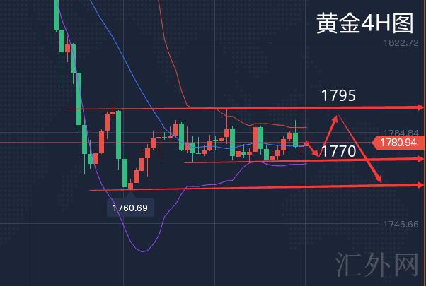 这周黄金就没有这么好机遇了,震荡久必然面临暴涨或者暴跌。当前从4小时来说,黄金价格在以下形成区间震荡。隔日行情持于中轨左右上下来回震荡,目前行情位于均线持于中轨以下运行,目前布林带处在开口期,MA均线三线朝下,KDJ随机指标三线向前,MACD指标红色量能柱开始缩量,快慢线平行向前,黄金短时间仍有下探趋势,但也存在来回震荡的机会性,但由于当前仍未有效击穿上方均线压力。综合来说,本星期一短线交易参考上推荐低多高空,上方短时间着重注意1797-1800一线压力,以下短时间着重注意1760-1765一线支撑。