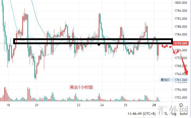 上星期五,我给了黄金1780-1784空单进场区间,黄金价格的确在这个区间执行了几个小时的震荡,受于在震荡以前黄金显现了增速上升,所以这个震荡大约率为中继,完全可以小盈利或者保本出场,后面黄金价格的确又一次上升到1790左右,或许洗掉一部分卖方。今天黄金在1780-1784区间又一次显现止涨信号,并朝下击穿了1774跌向1770左右,这个位置属于第二次进场机会,这里我们就不表了。