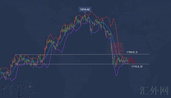 黄金技术分析来说日K线六连阴下跌趋势,MA5-MA10保持死叉下探,MACD绿柱能保持放量,布林带也维持朝下开口运行;周线上也是高点巨阴回调直接跌穿了布林中轨,MA5均线开始拐头朝下抑制,呈三连阴下探局势,惯性下挫仍有低位,1760不是本轮回撤目的地。依据波浪理论来说此波1916高点回调正是处在下探五浪阶段,而三浪低位正是1678W双底位置,再看4小时级别,价格上方承受内切趋势线的抑制,价格多次上探遭遇阻力,上升难度大,MACD快慢线在0轴以下走,短时期内还要死叉。所以,下周黄金行情卖方震荡朝下为主。下周等候价格回弹至内切趋势线左右看信号布局空单。计划前期低位1760左右。