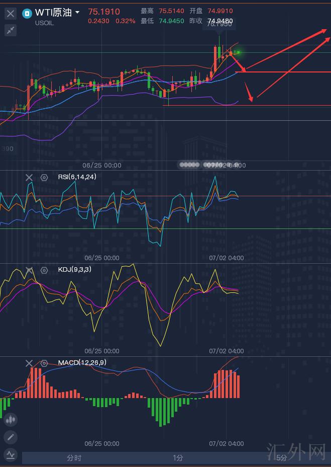 四小时来说,昨日冲顶回调后处在高点震荡,目前布林带处在开口期,MA均线在呈买方排列后,MA5日移动均线有拐头朝下趋势,KDJ随机指标三线并拢朝下,MACD指标红色量能柱开始缩量,快慢线金叉往上,综合来说,原油当前短时间回调趋势。