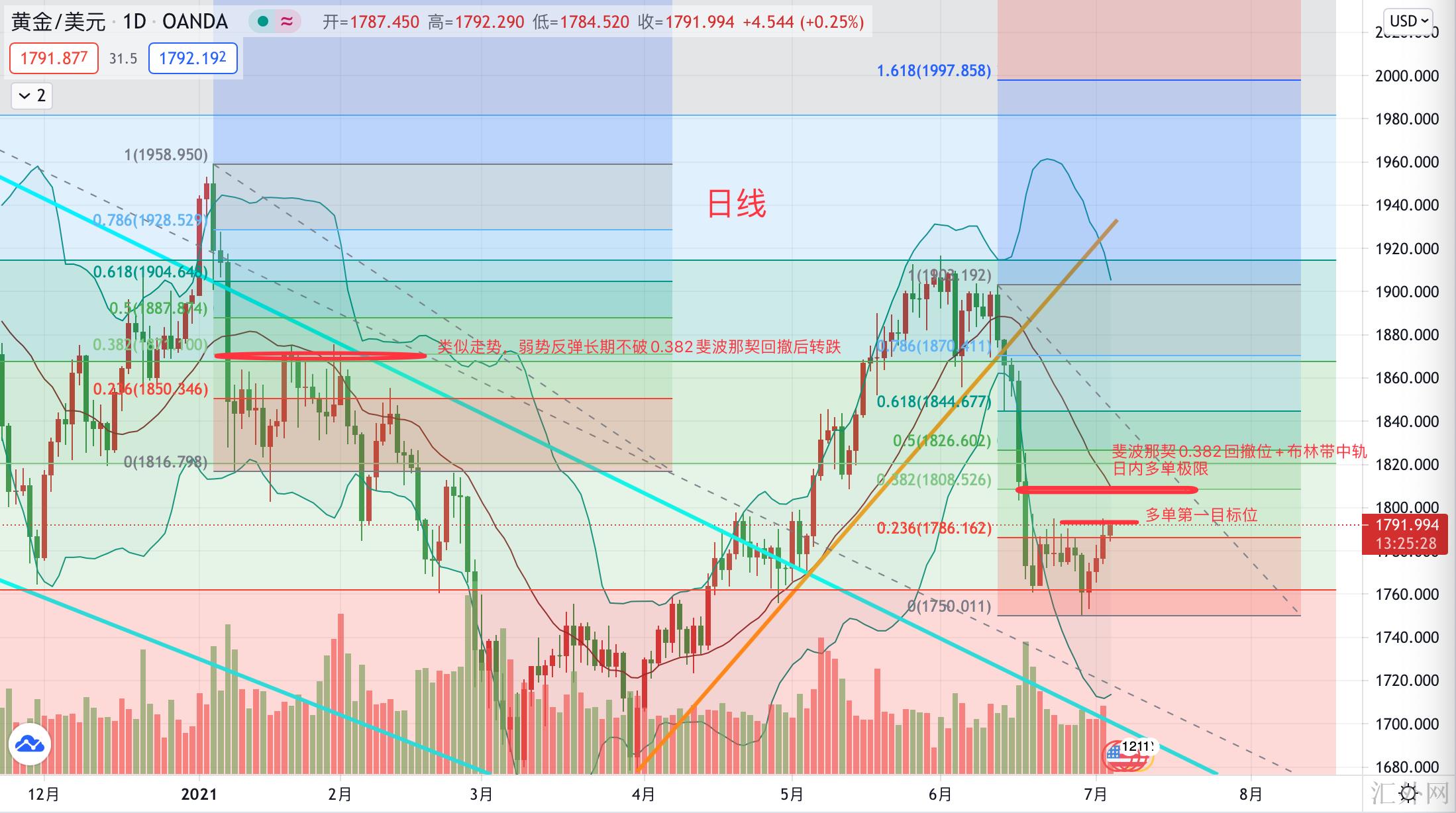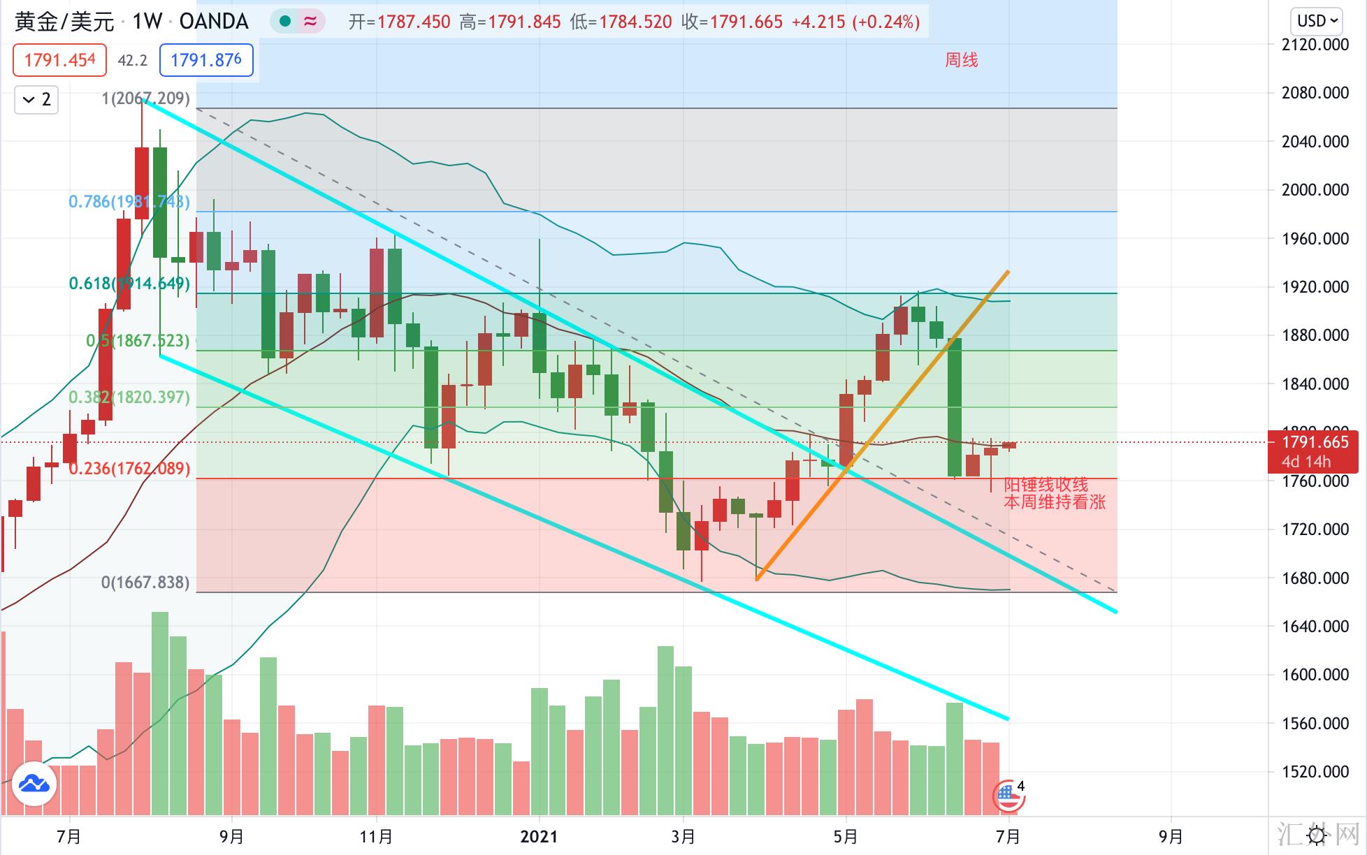 先看周线,上星期五夜里非农直播的最后,无论手里有没有交易,都交代各位关注一下周线的收线情形,假使这周想要持续保持买方形态,那周线起码要收在1780上方,结果也目睹了,周线收线1787,阳锤线结尾,以下破前低后快速回弹形成较长的下影线,一面表明1750左右存在较强支撑,另一面奠定了这周保持看多的风格。