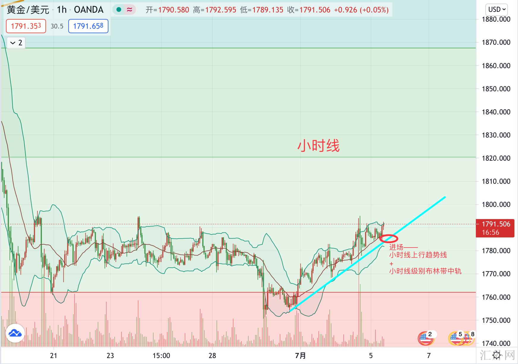 那么以下的接多位置就要参考小时线了,经历上周黄金从1753摸底回弹,小时线级别形成了一根短时间上涨趋势线,日间等回踩趋势线附差不多1782至小时线布林带中轨1785之间即可接多,这也是上午视频中交代的位置,而后发文阶段已经回踩证实过,不知各位有没有上车,假使没有的话,当前黄金这个位置肯定是不能追,想追单的话也起码要等到黄金价格实体击穿1797后面才做斟酌,可斟酌在1801轻仓挂一个多单,然而这里离日间天花板计划不远了,要不要挂各位自行斟酌。