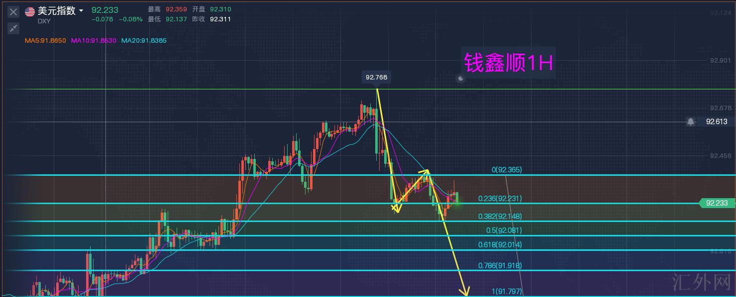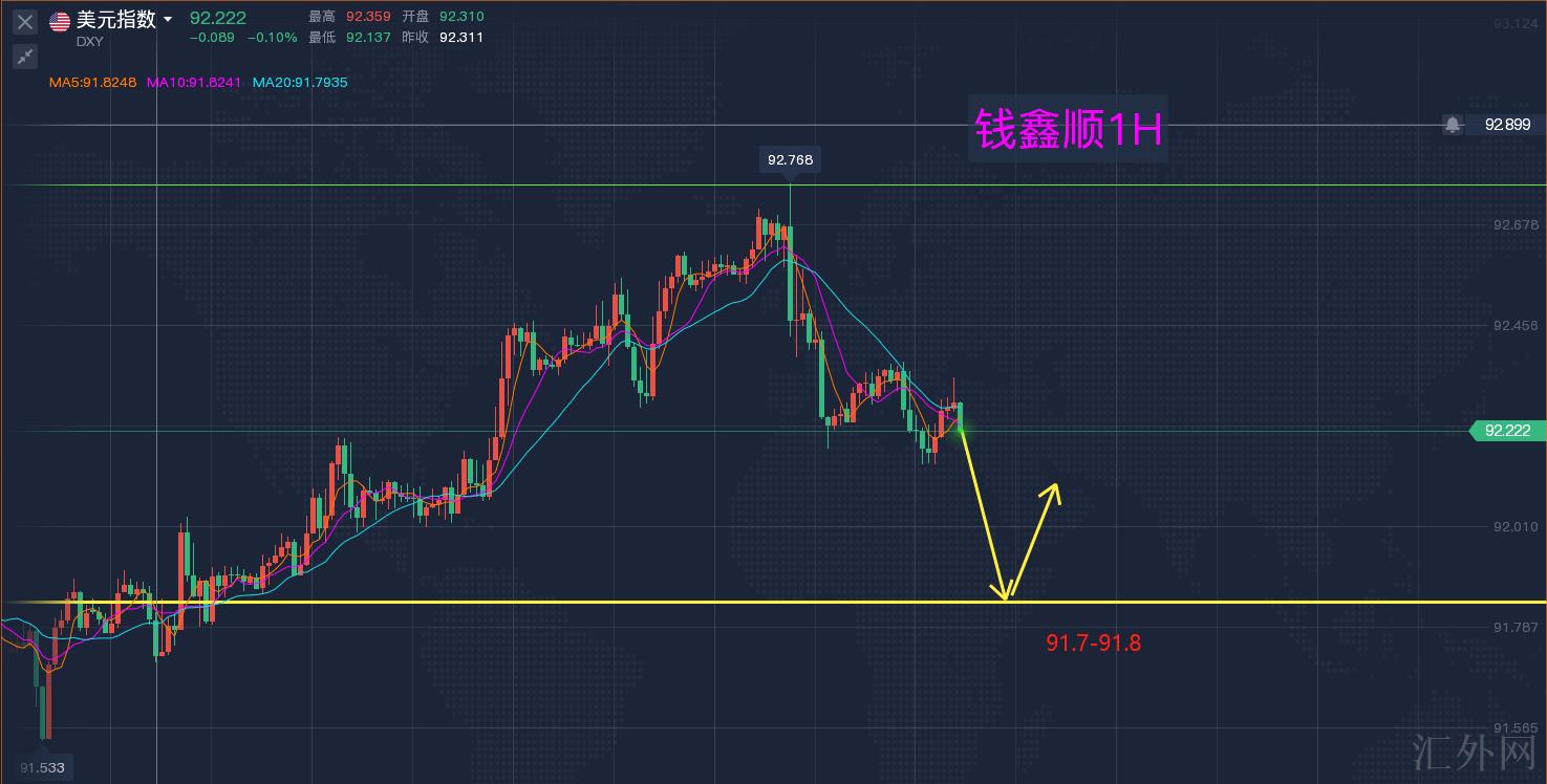 从当前美元来说,有很大约率会持续回踩,小时图假使说用AB=CD来分析的话,那么这段美元应当将是跌向91.8左右。
