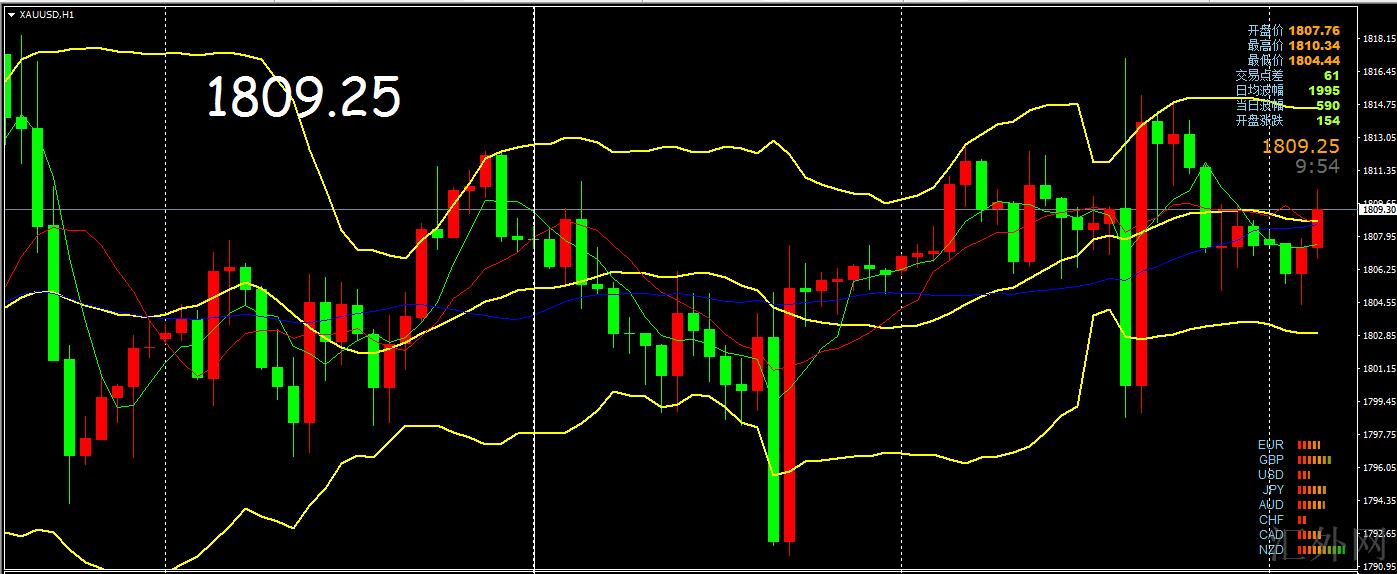 黄金从技术分析看,黄金行情依照当前的行情结构来说,当前黄金价格较为显著的是,上方1815/1818一线已经刷新,二次回调后面,降幅未能得到保持,而是故意无意的又一次去试探高位,那么依照前期降幅下探的回弹高位1820/25左右参考,短时间回弹突破1820一线就较为有效立住买方连续上涨看待。当下的行情依旧一个底部震荡反复的过程,该种迂回反复比较多,着重依旧环绕这个区间来布局,但是有一点可以肯定的是,盘面价格已经逐渐脱离这个底部,稳健的抬高,短线上操作注意区间的震荡;此外的话,关注高位1818的创下、1820的创下,假使说在一次击穿1820,那么才会真正的宣布这个买方的来临。四小时层面,黄金价格先跌后涨,今日保持上升遇阻于上缘1817一线压力,着重关注这一压力位,不破持续看回踩,目前布林带三轨走平,MA均线迈出双金叉,KDJ随机指标三线开口往上,到达超买,MACD指标底背离,快慢线金叉往上,表明黄金当前技术分析面对超买,但是整体还在区间内运行,综合来说,今日短线交易参考上推荐回踩低多为主,回弹高空为辅,上方短时间着重注意1818-1823一线压力,以下短时间着重注意1785-1790一线支撑。