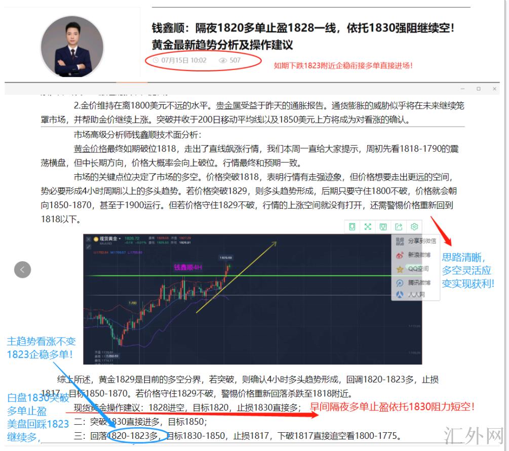 每一单均为依据黄金的行情指标形态结构以及消息面影响来给的,步步为赢,逻辑清晰,条理分明,这也是为何钱鑫顺可以抓住原油黄金大趋势行情以及大利润的原因!