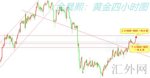 在今日星期四欧盘文章中,我也给大家文章中提及过了,上方1835这里处在日K线和周线的抑制点位置,所以没有这么容易击穿上去的。