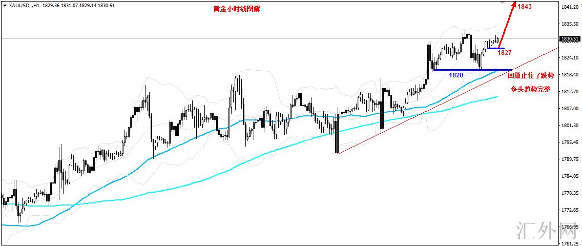 依旧那句话,趋势一旦形成并没有是那么容易更改的。日线阳线收官,4小时大阳线竖起,黄金价格回撤在1820一线止住了下跌趋势,仍未跌穿趋势线支撑,仍未跌穿中轨,高点盘整整理,中持续涨信号。所以,黄金趋势仍是买方,回撤持续多。小时线K线踩中轨1827激进可直接进场干多,稳健等回撤1821左右再多。司徒推荐1827左右直接多,由于强劲行情不会给你太多回撤的可能,等的结果只将是一步踏空,步步踏空。计划司徒依然看击穿攀高峰,波段1850不变。
