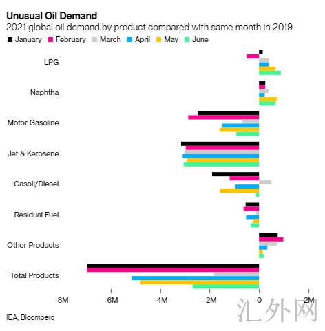 对比之下,航空燃料和汽油的需求仍十分乏力,上月合计为39.6万桶/天,差于2019年6月水平。海外石油产品的日需求量较两年前同期水平降低了27万桶。