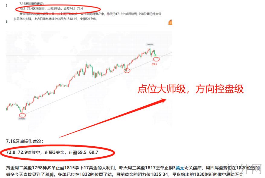 原油近期的行情震荡比黄金故意思,星期二的75.4 75.2压力位刷新多次后面,开始痛跌,我们这次也是全程拿下了这段超级的卖方利润,星期四再次给出的72.8 72.9买跌思路任然是冠绝全网的点位,方向。原油这段首要卖方全被我们拿下了。利润胜过500点。