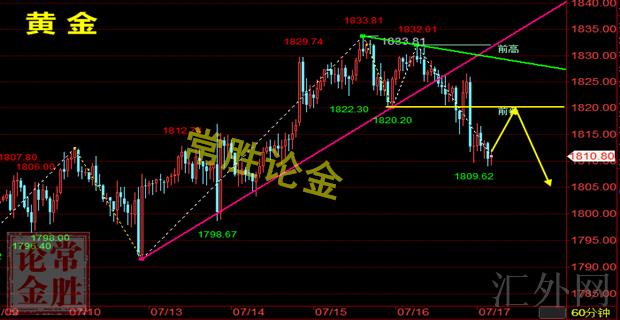 下周行情解析:黄金价格回撤跌穿1820,头肩顶形态得到证实,同期也跌穿了1791和1798连线的趋势线支撑,是突破下挫。日线大阴杀跌,迈出黄昏之星形态;4小时K线一根大阴线穿透中轨支撑,跌至卖方通道中;小时线头部形态异常清晰,K线完成对均线下穿,布林线拐头朝下运行。所以,黄金下星期一回弹就是空,这一点不需怀疑,反抽1820下顶底转换持续空。但是着重是空到哪里,空到什么点位。毕竟以下依然有1750和1791连线的趋势线支撑,在1808左右仍有支撑,K线若在1808一线止住了下跌趋势,仍或许持续看多,重拾上涨趋势。诚然一旦黄金价格又一次突破这个趋势线的支持。那么笔者短空将转波段空持续布局。所以,你若掌控不了节奏,最佳跟上常胜思路交易。