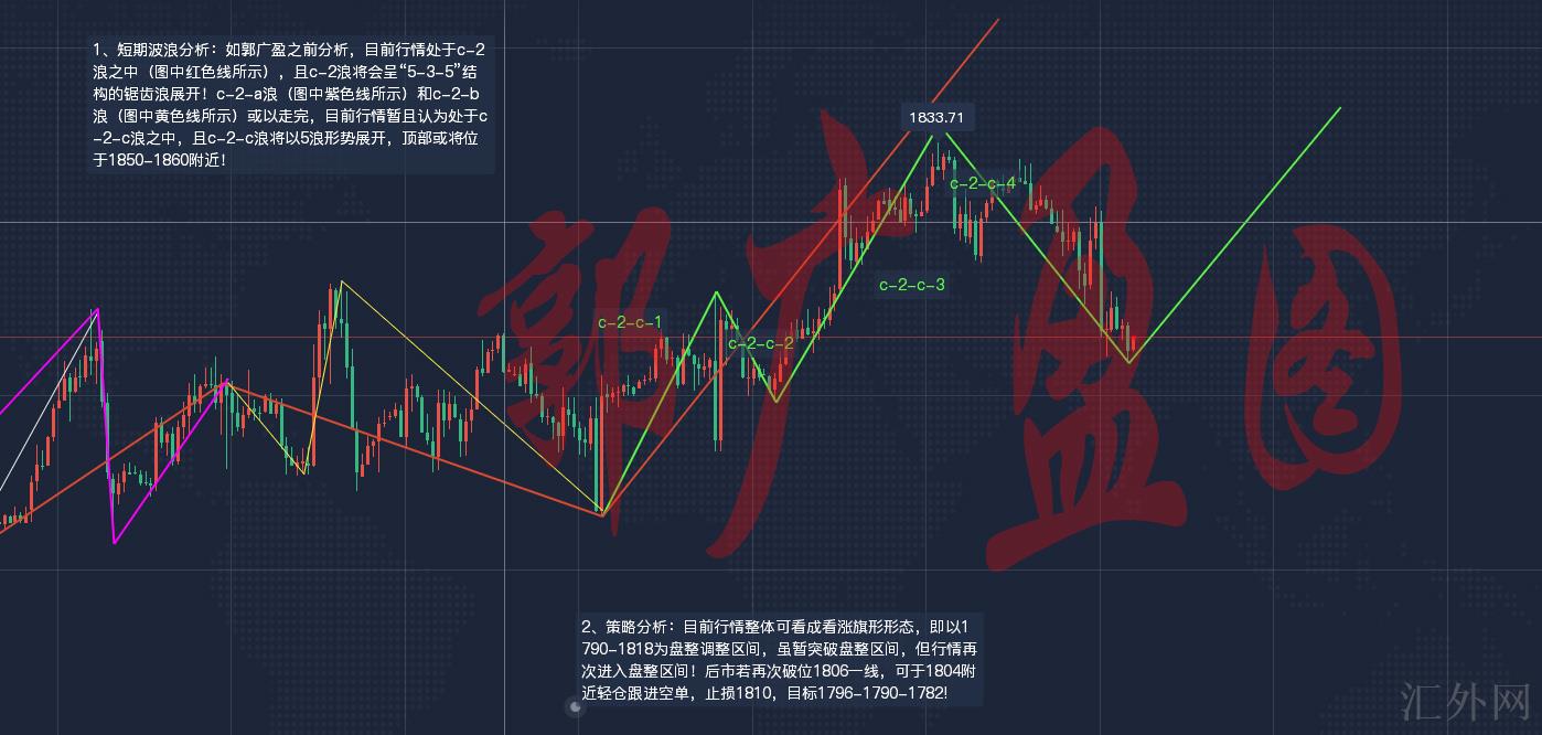 1、短时间波浪分析:如郭广盈以前分析,当前行情处在c-2浪当中(图中红色线所示),且c-2浪将令呈“5-3-5”结构的锯齿浪展开!c-2-a浪(图中紫色线所示)和c-2-b浪(图中黄色线所示)或已走完,当前行情暂且觉得处在c-2-c浪当中,且c-2-c浪(图中绿色线)将以5浪事态展开,顶部恐会位于1850-1860左右!