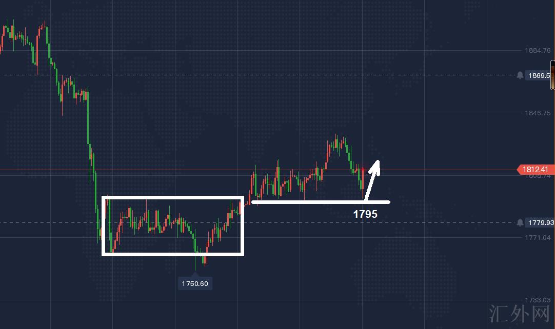 其次是刷新1795一线,这核心位置,刷新后面形成迅速反抽,那么这个位置为何显现如此的行情结果,由于前期的震荡环节区间上沿就是1795,在前期震荡环节我们就讲到假使突破1795一线,那么会顺势上涨,进而行情冲顶到1830上方,而星期五收尾后面开始回调。