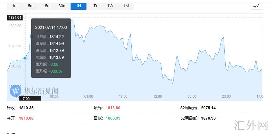 星期二,黄金现货美盘时段短线下跌,最多失守1810美元关键点位,刷新日低1805美元,最终收盘下跌0.14%,报得1809.81美元每盎司;