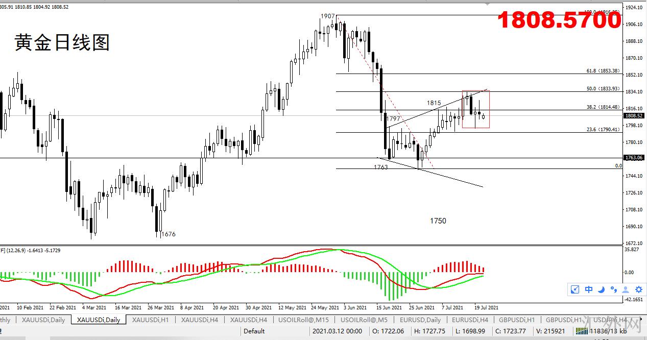 受于日K线近期两天看震荡,短线的指标也没有太明朗的趋势,所以对短线来看,我们需求证实行情是以什么样的形态震荡,当前个人更倾向是收敛三角形,即图中所画区域,日间所需求关注的压力在1817,此位置是昨天大阴线朝下击穿的顶底转换位,而伴随时间的推动,上方从1834以来的下滑趋势线的阻力亦在此,假使是收敛三角形的情形,那么今天下挫的低位便不能差于星期一的1794,若差于此位置,则当心行情显现朝下击穿的机会,夜间需求关注的支持在从1791以来的上涨趋势线支撑,伴随时间的推动,此位置大约在1796上下。