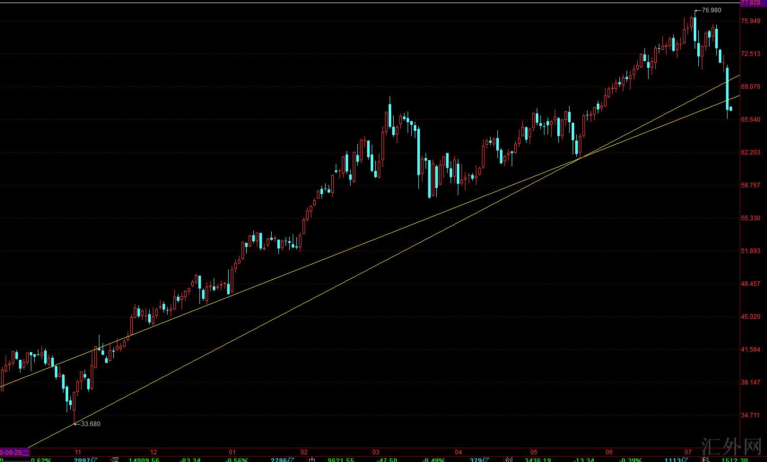 从7月初开始原油从76.9的最高位一路下挫,最低70.3,中间也胜过66美金的降幅,其中有两次大的中期波段布局,我们两次都抓在最高位,昨天原油更更深一步从71.4的位置直接痛跌到65.6.一个交易日接差不多60美金的单边行情,交易上我们早盘71.3跟进的一次中期空单最终面临了痛跌止盈,可惜的是最后在67.5左右的支持点的买涨止损一单。