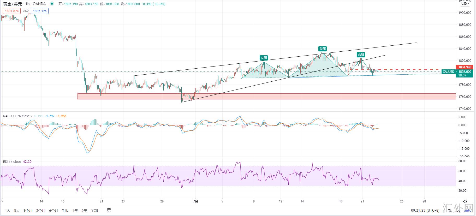 黄金小时图,咱们一个个周期来讲,由小到大,首先呢,能目睹在小时级别上黄金迈出了一个头肩顶形态,当前对黄金起到支撑作用是头肩顶的颈线,或者呢,你完全可以把这条颈线当成一条趋势线来说,所以1796一线形成黄金当前的核心支撑,该位置假使跌穿,那依照头肩顶的理论下挫程度来计算的话,下挫计划在1756,记住这个位置!