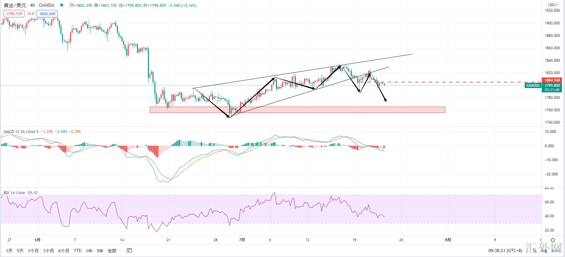 黄金4小时图,再来说这个楔形,这个楔形已经说了好几天了,当前黄金是完成了楔形的突破回踩,依照理论下挫程度来计算的话,黄金楔形突破后面的理论下挫计划在1758左右,受于楔形的上缘不固定,所下方挫计划点位也有差别,但是总的规模就在图中红色区域内,和头肩顶的理论下挫计划点位高度重合。
