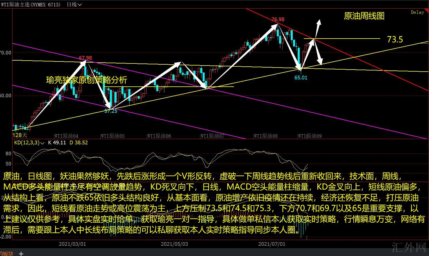 原油,日K图,妖油果然够妖,先跌后涨形成一个V形反转,虚破一下周线趋势线后从新收回来,技术分析,周线,MACD买方能量柱走尽有空调放量趋势,KD死叉朝下,日K线,MACD卖方能量柱缩量,KD金叉往上,短线原油看多,从结构向上瞧,原油不跌65依旧买方结构不错,从基本分析看,原油增产依旧流行病仍在连续,经济还复苏不足,打压原油需求,所以,短线看原油行情或高点震荡为主,上方抑制73.5和74.5和75.3,以下70.7和69.7以及65是重要支撑,以上推荐仅供参考,具体实盘实时给单,获取瑜亮一对一指导,具体做单私信本人获取实时策略,行情瞬息万变,网络有落后,需求跟上本人中长线布局策略的可以私聊获取本人实时策略指导同步本人圈。
