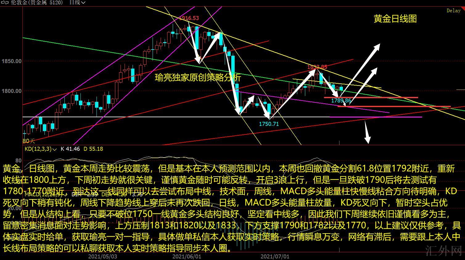 黄金,日K图,黄金这周行情比较震荡,但是差不多在本人预期规模在内,这周也回撤黄金分割61.8名置1792左右,从新收线在1800上方,下周初行情就很核心,审慎黄金随时或许反转,开放3浪上涨,但是一旦跌穿1790后将去试探有1780-1770左右,到达这一线同样可以去试图布局中线,技术分析,周线,MACD买方能量柱快慢线粘合方向待清晰,KD死叉朝下略有钝化,周线下滑趋势线上穿后未又一次跌至,日K线,MACD买方能量柱放量,KD死叉朝下,临时卖方占优势,但是从结构向上瞧,只要不突破1750一线黄金买方结构不错,坚定看中线多,所以我们下周持续依旧审慎看涨为主,留心密集消息面对行情影响,上方抑制1813和1820以及1833,以下支撑1790和1782以及1770,以上推荐仅供参考,具体实盘实时给单,获取瑜亮一对一指导,具体做单私信本人获取实时策略,行情瞬息万变,网络有落后,需求跟上本人中长线布局策略的可以私聊获取本人实时策略指导同步本人圈。