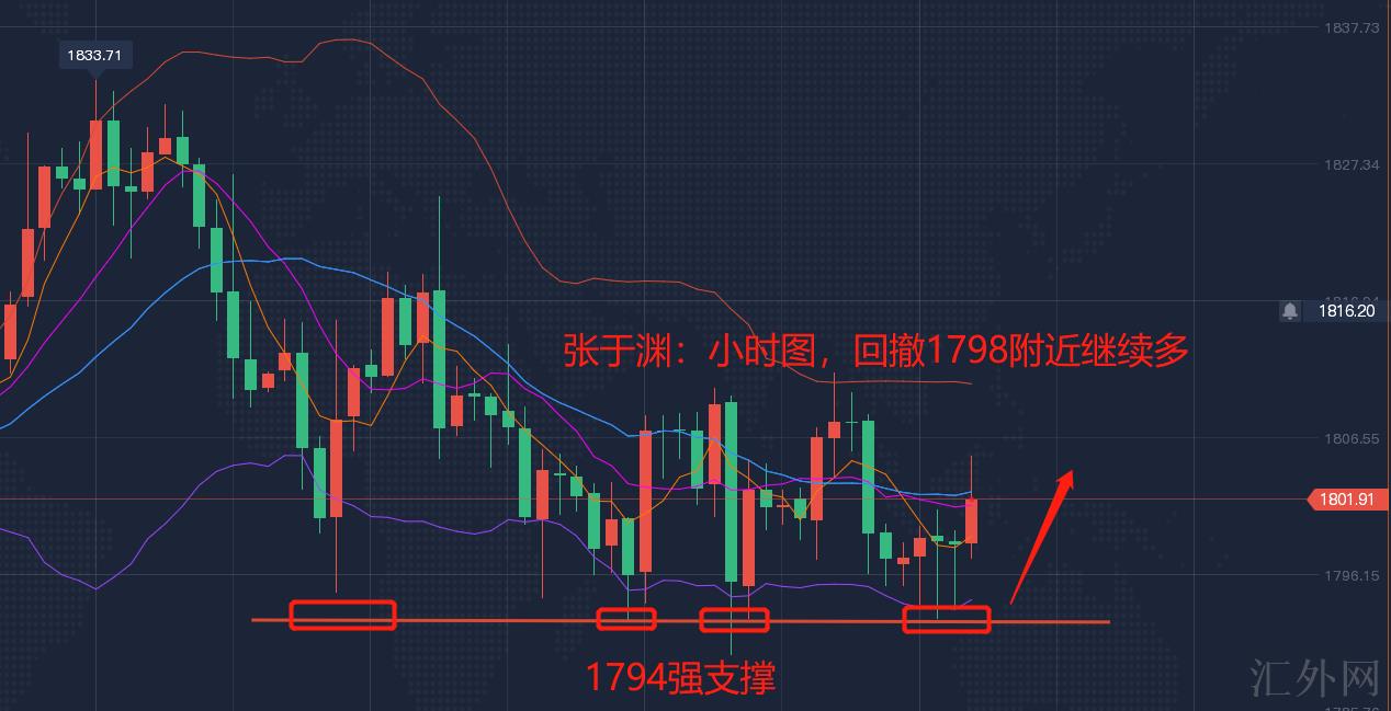 今日从早到晚均为坚持干多的,亚盘1794现价多单,午后1794持续干多,美盘以前回撤1794依旧坚持干多,由于1794一线的支持太强了,跌不破就会大涨。黄金价格现报得1804,多单可先获利减仓,落袋为安。