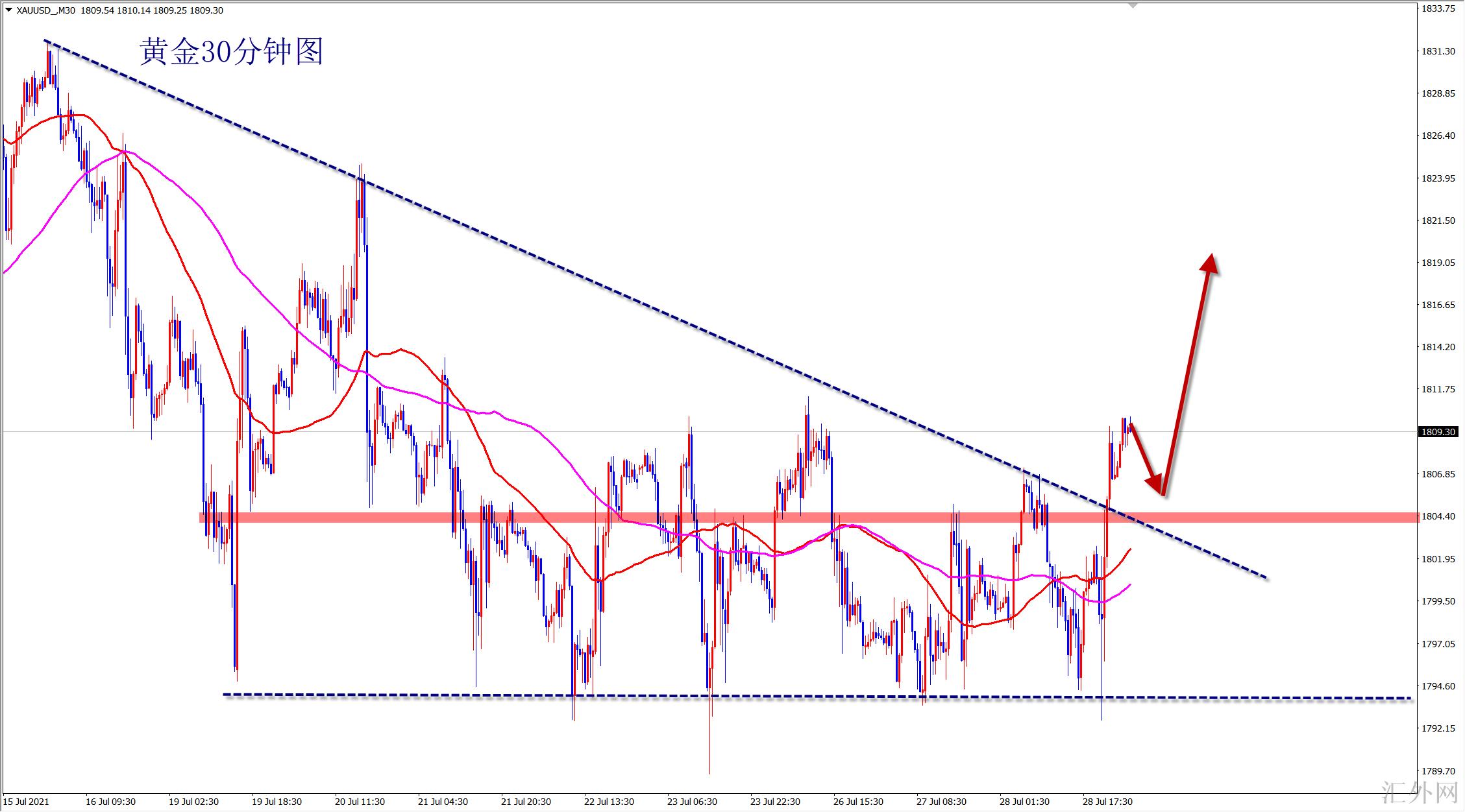 震荡击穿,趋势开放,抓住机会就是干!此次上升不同在此之前的震荡,目前已经击穿了在此之前三角形整理的上沿阻力,并在亚盘一举拿下1810左右的阻力,而且击穿后无回踩,买方异常强劲,上升仍在持续!