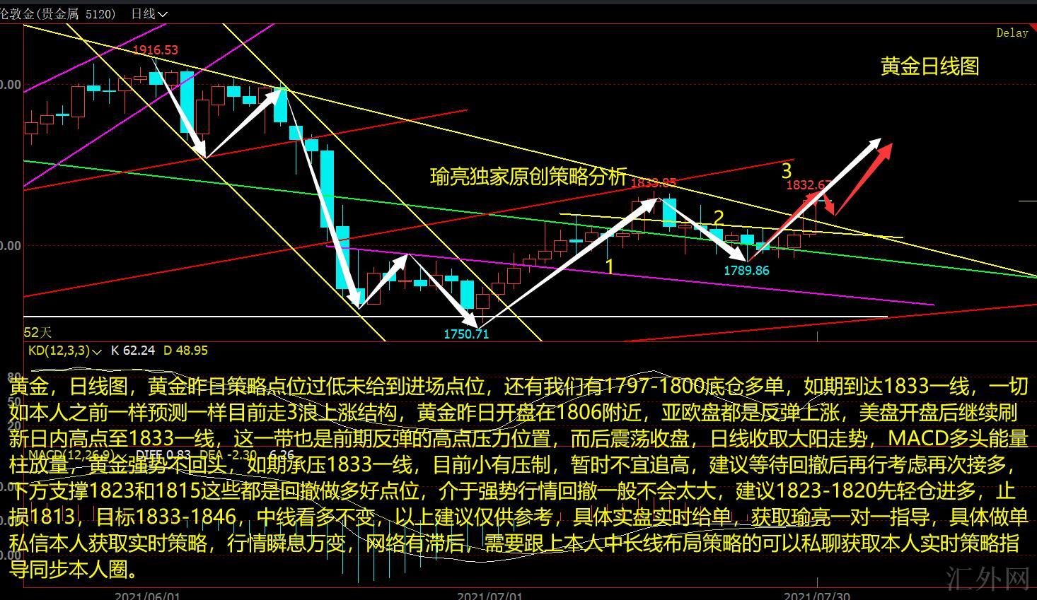 黄金,日K图,黄金昨日策略点位过低未给到进场点位,仍有我们有1797-1800底仓多单,按计划到达1833一线,一切如本人以前一样预期一样当前走3浪上升结构,黄金昨日开盘在1806左右,亚欧盘均为回弹上升,美盘开盘后持续创下日间高位到1833一线,这一带也是前期回弹的高位阻力位置,而后震荡收盘,日K线收取大阳行情,MACD买方能量柱放量,黄金强劲不回头,按计划遇阻1833一线,当前小有抑制,临时不宜追涨,推荐等候回撤后再行斟酌又一次接多,以下支撑1823和1815这些均为回撤买涨好点位,介于强劲行情回撤一般不会太大,推荐1823-1820先轻仓进多,止损1813,计划1833-1846,中线看涨不变,以上推荐仅供参考,具体实盘实时给单,获取瑜亮一对一指导,具体做单私信本人获取实时策略,行情瞬息万变,网络有落后,需求跟上本人中长线布局策略的可以私聊获取本人实时策略指导同步本人圈。