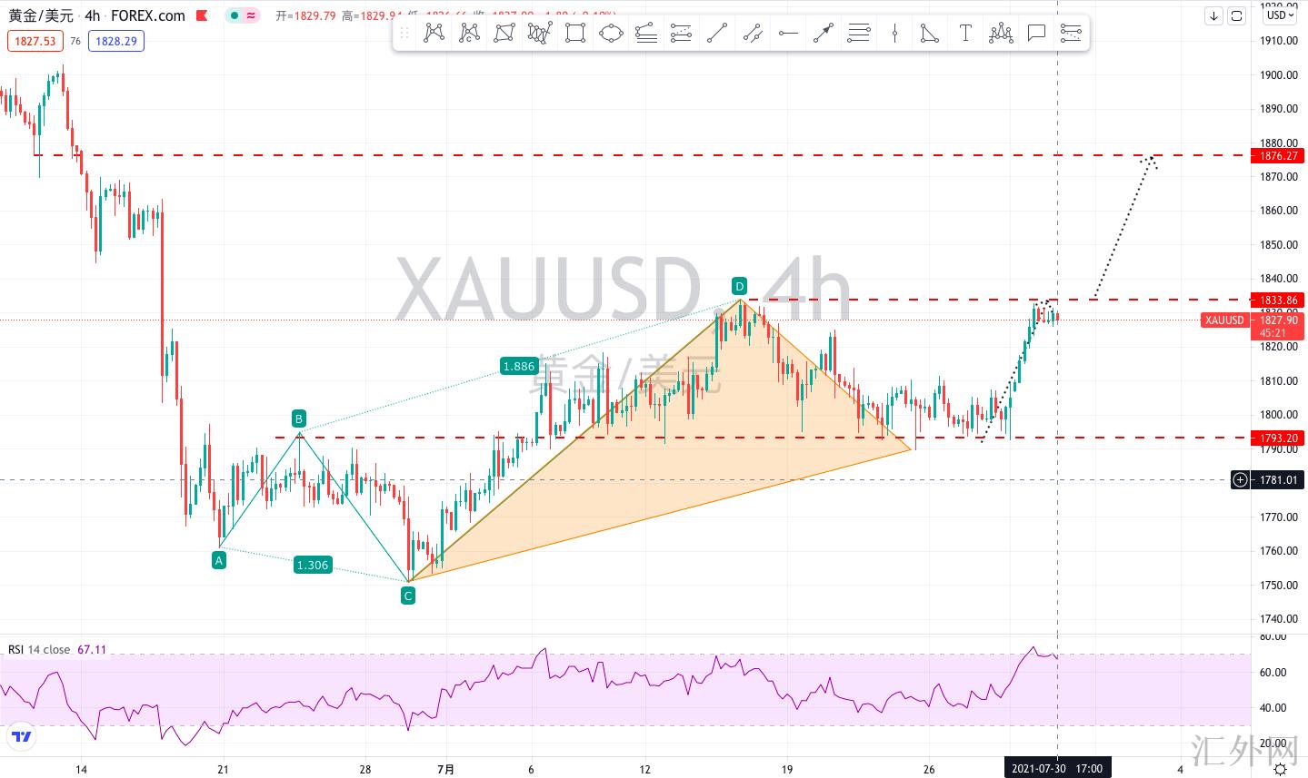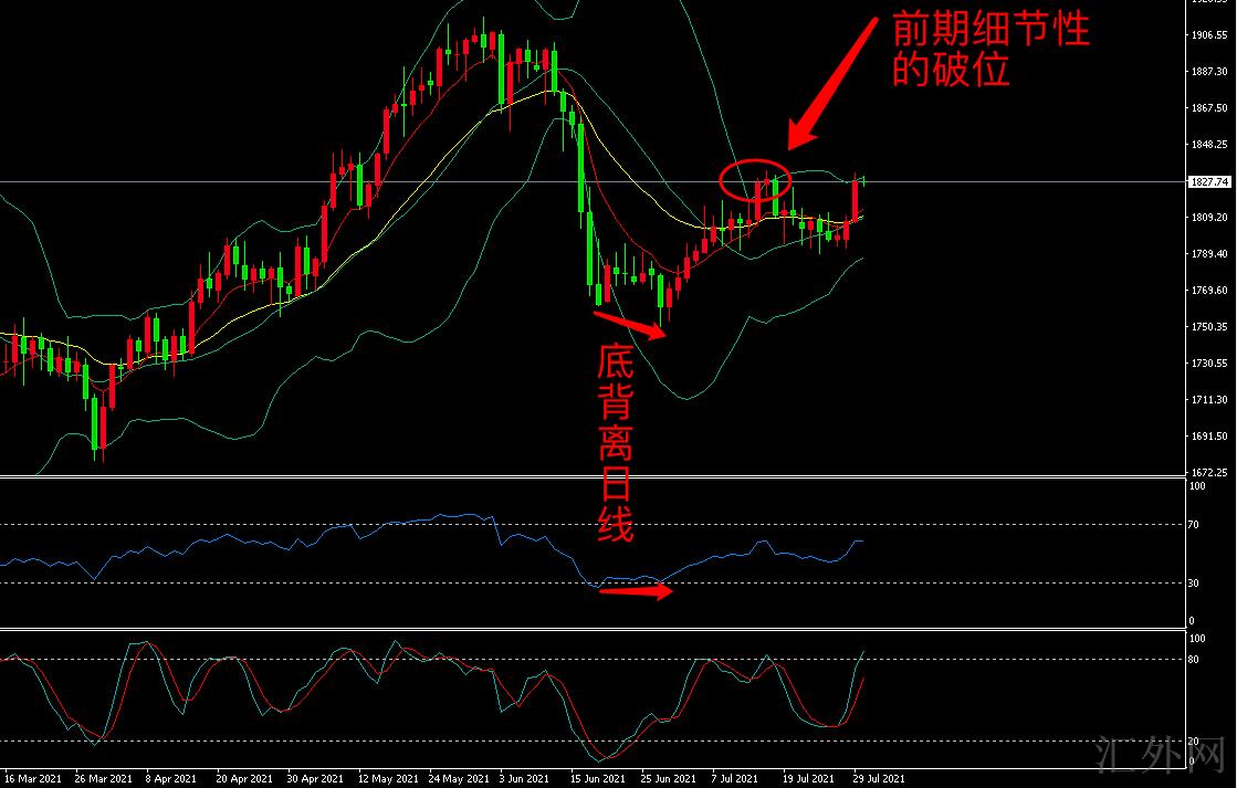 那么这个信号在交易中经常运用的分析就是,已经奠定了上升趋势确立如此的一个风格。那么接下去市场回撤下挫,回踩布林带中轨,随后开始此次的上涨,依我看来是一定会击穿前期1833的阻力位的,要不然从技术分析的这段回撤来说,回撤是没故意义的。所以从这一个明细来说,任然是看多黄金不变的。