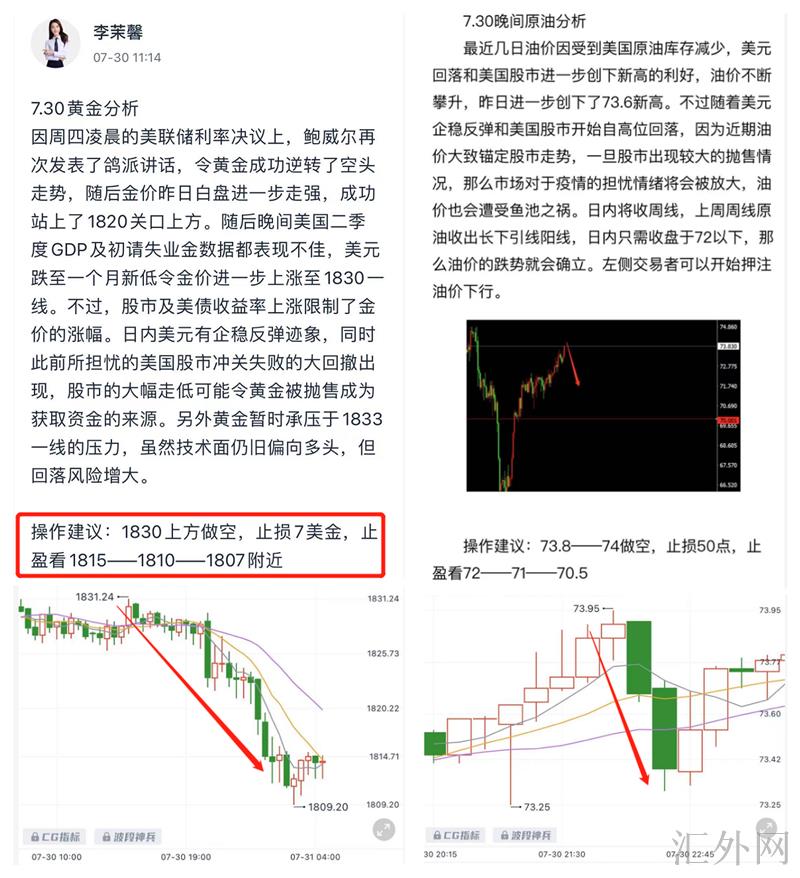 星期五茉馨给到黄金差不多是顶部的空单,第一第二计划完美扫到,可惜的是时间过于晚了,空单于1820左右已全部退场;此外日间原油白盘先给到最低点的73.3激进空单仅差0.5扫损,夜里又一次于73.8左右执行了补仓,最终于第一次回踩中保本退场!(止盈10点)