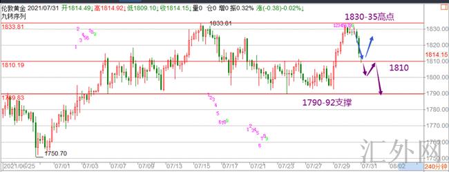 星期五尽管下挫了,但星期一不必过分看空,而是依托1808-10的支持可以进场买涨,上方预期还能再涨到1830-35区域的。所下方周开盘只要不是直接暴跌的情形下,是值得进场买涨的。持续依照震荡的思路对待当下的行情!