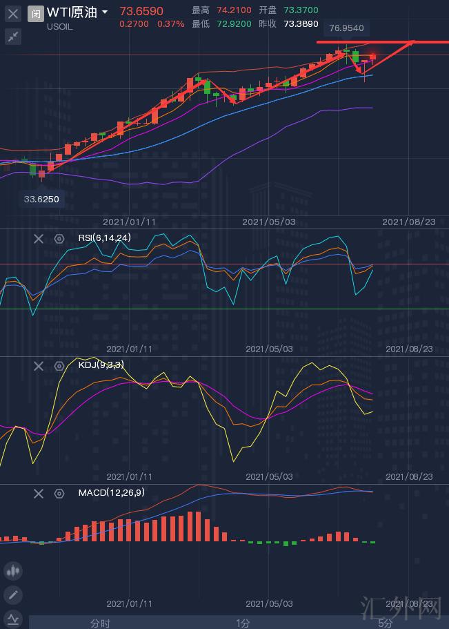 日K线上来说,原油价格在击穿中轨72.5后震荡虽不大,但上涨趋势还在保持,日移动均线双金叉支撑原油价格上涨,MACD指标绿色量能柱初始转换为红能,快慢线适当开口往上,示意原油价格买方仍未开始发力,所下方周的上涨空间依旧比较大的,然而适合注意的是布林带走平,所以在将来几周在没有大有助于的情形下,原油很难击穿77高位,所以77则是最近的强阻!