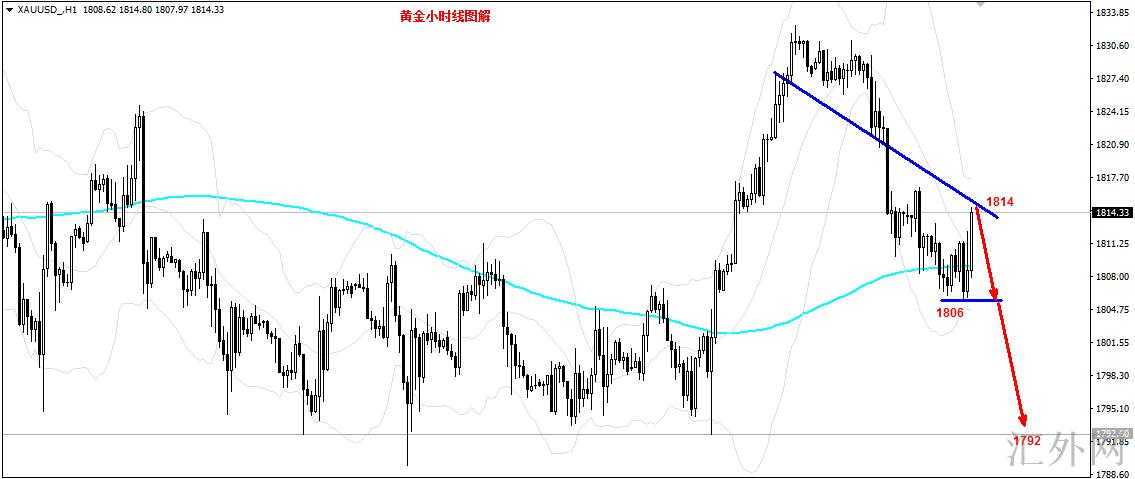 黄金价格回弹1814,正是空单进场机会,现价空。黄金价格上星期五跌穿1814一线支撑,今日盘中保持下挫,同期跌穿1808一线支撑,完成顶底转换,即使美盘短线回弹,属于正常,并没有能看为反转,所以,现价直接进场放空。