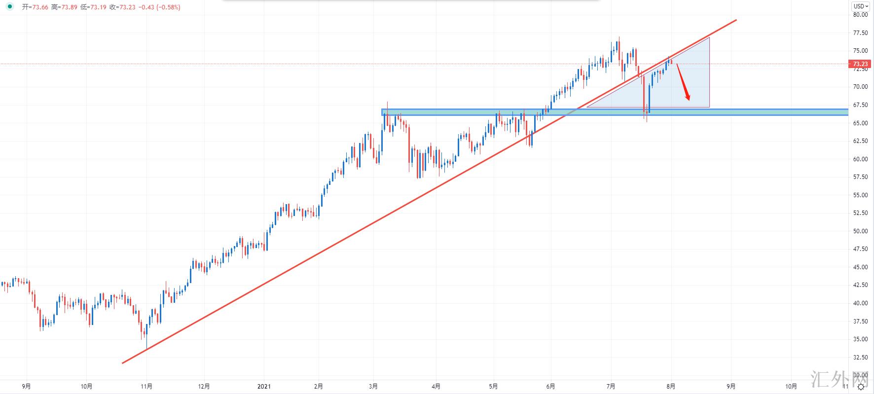 【技术点评】:D1周期,原油价格跌穿上涨趋势线,并完成回踩动作。