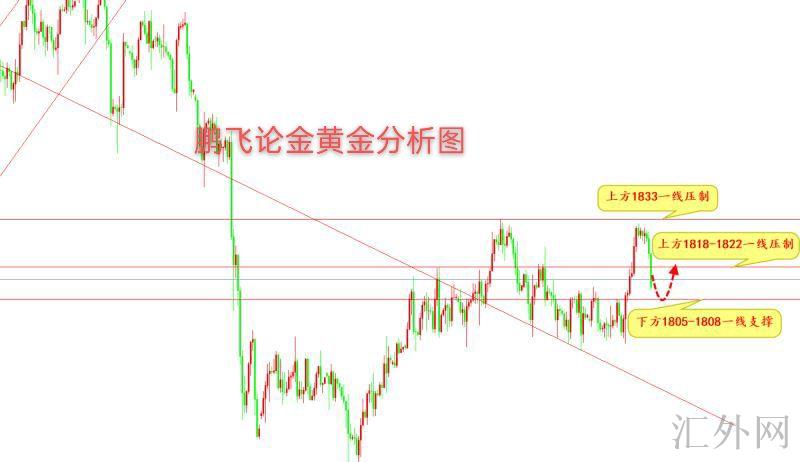 上面分析图是今天的思路,昨晚午夜也是给出了1818一线的空单,今日早间1812一线提示出局,当前黄金在适当回调,支撑带在1805-1808这一带,白盘我们可以依托这个支撑先多一次,这段回踩不会形成单边,回踩后还会持续涨、持续试探午夜1819的高位,从理论上表达回踩跌穿1805-1800将令更改形态,此外1833也成了新的阻力点,后期任什么时候候靠近都可以又一次空一下,今天白盘我们预期的区域是1805-1833。鹏飞论金推荐注意1805-1808一线支撑,关注上方短时间1818-1822一线阻力,着重关注阻力1833。
