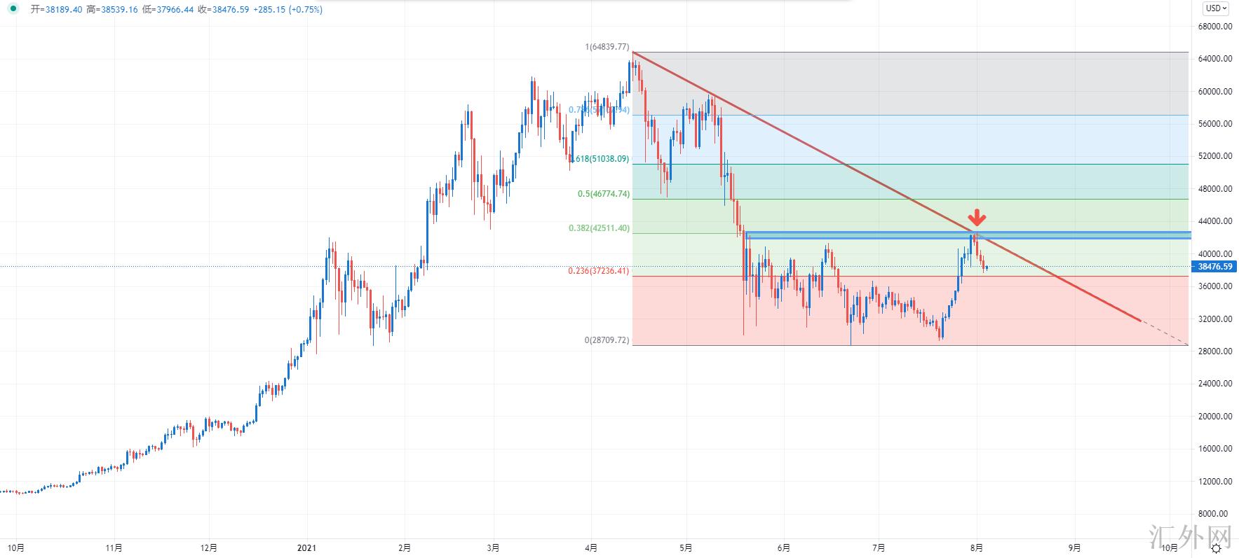 【技术点评】:H4周期,比特币试探下滑趋势线与水平压力位,同期是斐波那契38.2%回踩位。