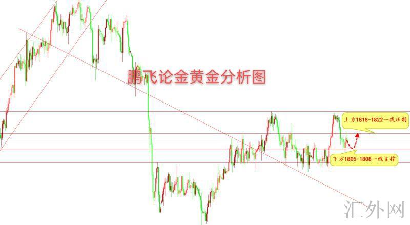 上面分析图是当前的思路,从理论上表达回踩跌穿1805-1800将令更改形态,此外1833也成了新的抑制点,今天依旧是1805-1833区间震荡。鹏飞论金推荐注意1805-1808一线支撑,关注上方短时间1818-1822一线抑制,着重关注阻力1833一线。