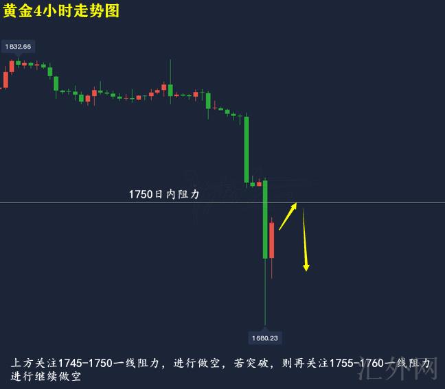 黄金技术分析来分析,日K线上,上星期五黄金遇阻MA5-10日移动均线展开下探,盘中跌穿下缘,报得大阴;4小时上,上星期五黄金白盘震荡迟缓下探,夜里大阴跳水下挫,在刺破下缘创下低后持于低点盘整,今日早间行情开盘上到1765.2美元高位后展开跳水下挫,盘中失守1700美元关键点位,创下日间低点1680.23美元每盎司,并在刷新日间低点后回涨,目前布林带处在开口期,MA均线三线朝下,KDJ随机指标往上延伸,MACD指标绿色量能柱连续放量,快慢线死叉朝下,综合来说,黄金当前处在摸底回涨修正当中,但上方仍有抑制,日间推荐持续维持买跌,上方注意1745-1750一线压力,若行情显现击穿,则再注意1755-1760一线压力,执行持续买跌。