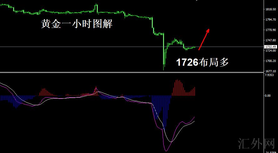 黄金一小时k线显然是止住下跌趋势了,以下MACD能量柱显著的位于零轴上方,同期逐渐加大,这是明摆着的买方,也组成显著的金叉,隔夜黄金在1726左右就已经止住下跌趋势,亚盘直接推涨到1730上方,同期立住支撑点1730上方,接连收线大阳线,依托1726一线直接多