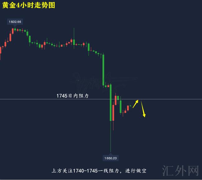 黄金技术分析来分析,日K线上,隔日黄金跌向四个月低位,并在跌向日间低点后适当回涨,报得带长下影线的大阴,日K线上,今日行情适当回涨,但仍有下探的机会性;4小时上,隔日黄金亚盘新低后回涨,并又一次遇阻MA10日移动均线后下探,目前布林带处在开口期,MA均线三线朝下,KDJ随机指标三线往上,MACD指标绿色量能柱开始缩量,快慢线平行向前,综合来说,黄金当前即使仍处在回涨,但上方均线抑制仍未击穿,日间推荐回弹买跌,上方注意1740-1745一线压力。