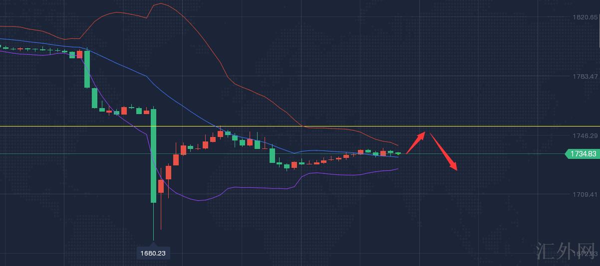 星期一黄金现货呈现V型行情。亚盘初,黄金价格最多闪崩差不多100美元刷新1680关键点位区域,随后摸底回弹,收窄降幅,回补普遍失地,最高刷新1752左右,夜里受于又一次承受美元走高及美联储官员鹰派发言的冲击,最终收盘下跌于1729左右,日K线收带长下影线阴线。