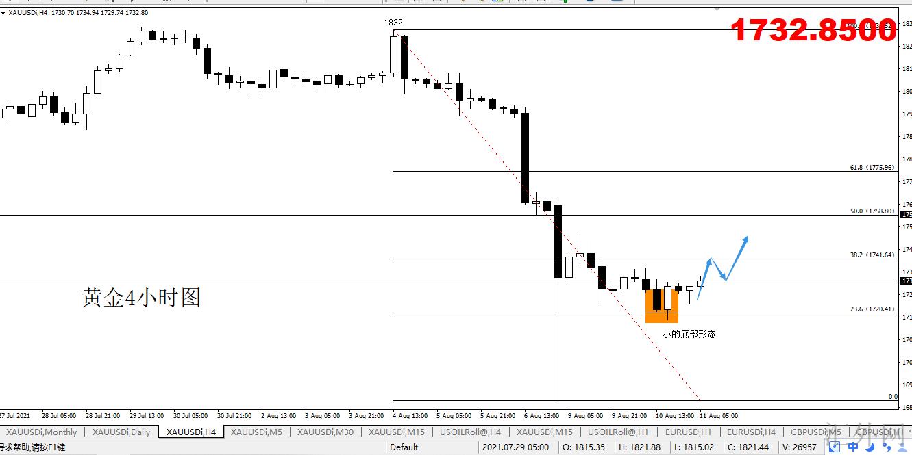 4小时层面,昨天按计划执行了二次回踩底部的动作,在1720一线持稳,并形成了小的阳包阴的底部看多形态,然而当下短线的上涨强度还没有完全出来,需求等候短线买方的蓄力暴发,今天早间下测1725左右后持稳,便证实了今天的回弹局势,日间需求关注的回弹第一压力位在1741一线,此位置是1832下挫以来的38.2%回踩位,具有适当的压力,需求注意的是此位置即使遇阻,大约率也是一个小的回调调动,此段4小时的回弹证实后面的上涨计划大差不差在1868一线,是我们日K线看的买跌位置,击穿1750便是此看法的证实信号,近两日的操作层面在底部形成支撑推荐低多为主,导致在1750上方后便需求审慎买涨。