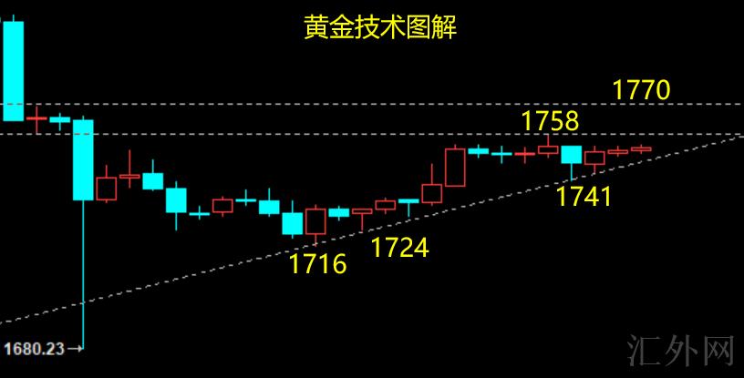 星期四价格冲顶1758滞涨回撤1741完成蓄力,隔夜重回1750上,日线图连阳,K线组合呈排列看多,预计日间仍会试探1758压力,突破则打开上方空间;白盘时段短线支撑1752-1750,强支撑12H-MA5-1748;短线压力1756-1758,强阻1762-1770;