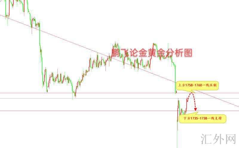上面分析图是当前的思路,从形态来说涨头还会持续涨,1758-1760一线依旧有回撤的可能,回撤的程度不能看的太大,昨天刷新1758一线回撤至底点1743左右,小回撤的可能可以直接上多单,形态支撑已经攀升到了1738-1735一线,从形态和指标向上瞧价格在1735-1738一线上方都处在买方。操作上鹏飞论金推荐高空低多对待,假使1758-1760阻力有效,则黄金整体还将是有偏空震荡回调过程的,以下可注意1735-1738一线支撑。实时策略操作请私聊本人给出。
