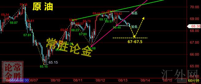 4小时上,原油持续保持回弹,上方抑制可看到上星期五的高位70一线,当前来说,4小时的回弹空间依旧有的,70恐怕是拦不住的,再上方的70.7和71.9可以着重关注下,小时级别来说的话,尽管有个顶背离形态,但是因为于4小时快慢线开口这么大,小时级别的顶背离是肯定不会有大幅回调的,或许会迈出二次甚至三次背离后面这段回弹才会终结,下挫才会从新开始!